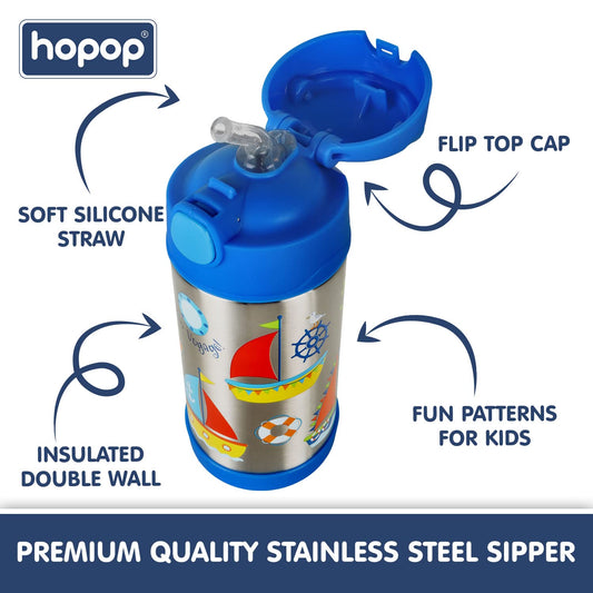 Hopop Insulated Stainless Steel Sipper Water Bottle for Kids | Double Walled Insulated Steel | Cold Water Sipper Bottle with Straw & Carry Handle | Thermos Flask | BPA Free | 300ml | Boat