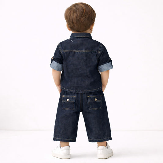 DONOO Boys Dark Blue Denim Shirt & Capri Pants Set | Stylish Kids Denim Co-Ord Outfit (18 Months – 14 Years)