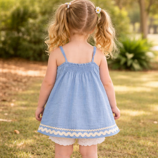 LEO N BABES Girls Blue Cotton Summer Dress with Floral Applique (18M–12Y)