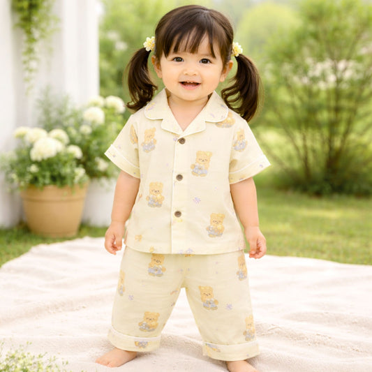 NUM NUM Baby Boys Cotton Night Suit Set – Cute Teddy Print Shirt & Pant Set (9M–3Y) Yellow