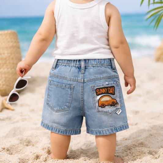 Smile Baby Boys Denim Shorts with Sunny Day Patch – Elastic Waist Casual Shorts (9M-5Y) | Black, Khakhi, Light Blue, Ice