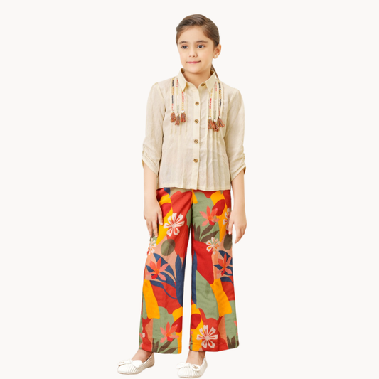 Tiny Baby Girls Beige Shirt & Multicolor Floral Palazzo Set – Trendy Festive & Party Wear Outfit (4–12 Years)