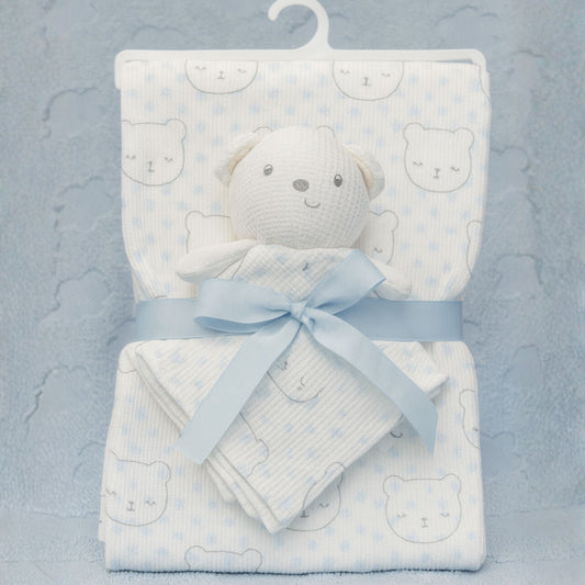 SUNNOZY Baby Blanket with Snuggly Teddy Bear Toy – Ultra Soft Ribbed Fabric | Cute Bear Print | Newborn Gift Set (Size: 75×100 cm)