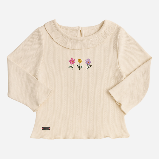 Orrigany Girls Cotton Top – Fawn Ribbed Knit with Embroidered Flowers & Ruffled Collar | Soft, Elegant Daily Wear for Kids (1–6 Years)