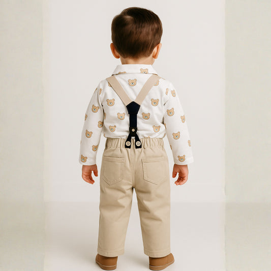 SMILE BABY “Classic Bear Suspender Set” – Khaki Shirt & Pant Outfit for Boys (3 Months to 3 Years)