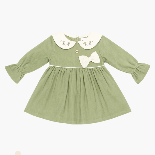 Orrigany Baby Girls Cotton Frock – Olive Green Long Sleeve Dress with Peter Pan Collar & Bow | Elegant Daily & Party Wear (1–4 Years)