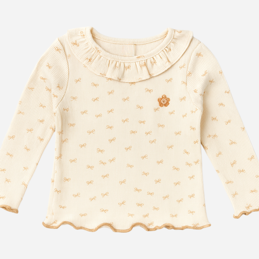 Orrigany Girls Cotton Top – Fawn Ribbed Knit with Embroidered Flowers & Ruffled Collar | Soft, Elegant Daily Wear for Kids (1–6 Years)
