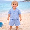 The button-down shirt with a relaxed collar gives a smart casual look, while the elastic waistband shorts ensure a comfortable and flexible fit for active toddlers. Whether it's a family outing, vacation, or casual day out, this outfit keeps your baby looking cute and stylish.