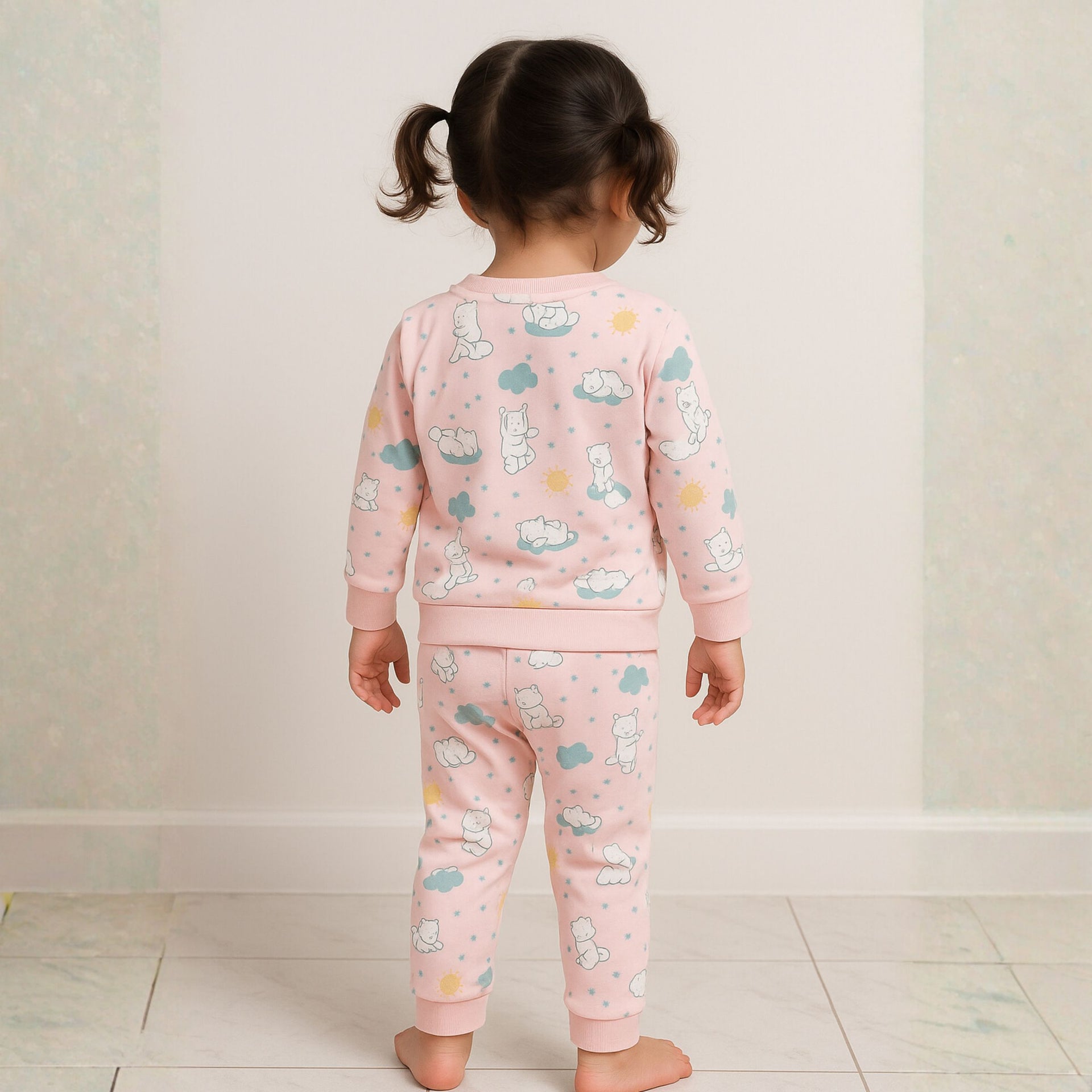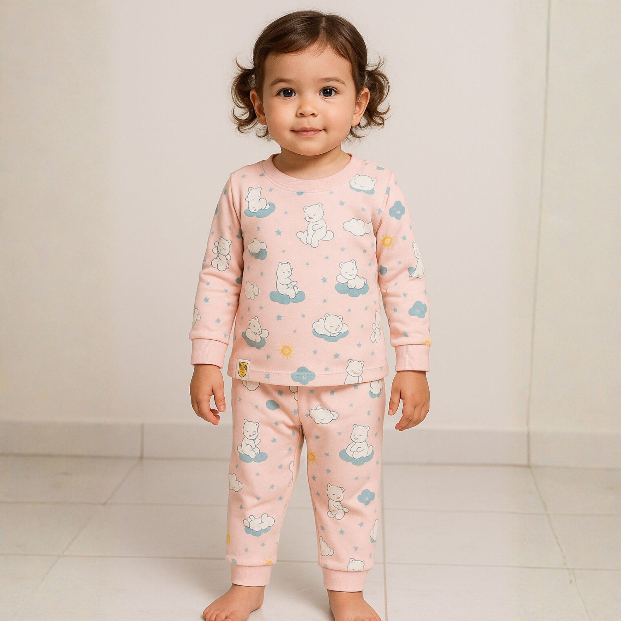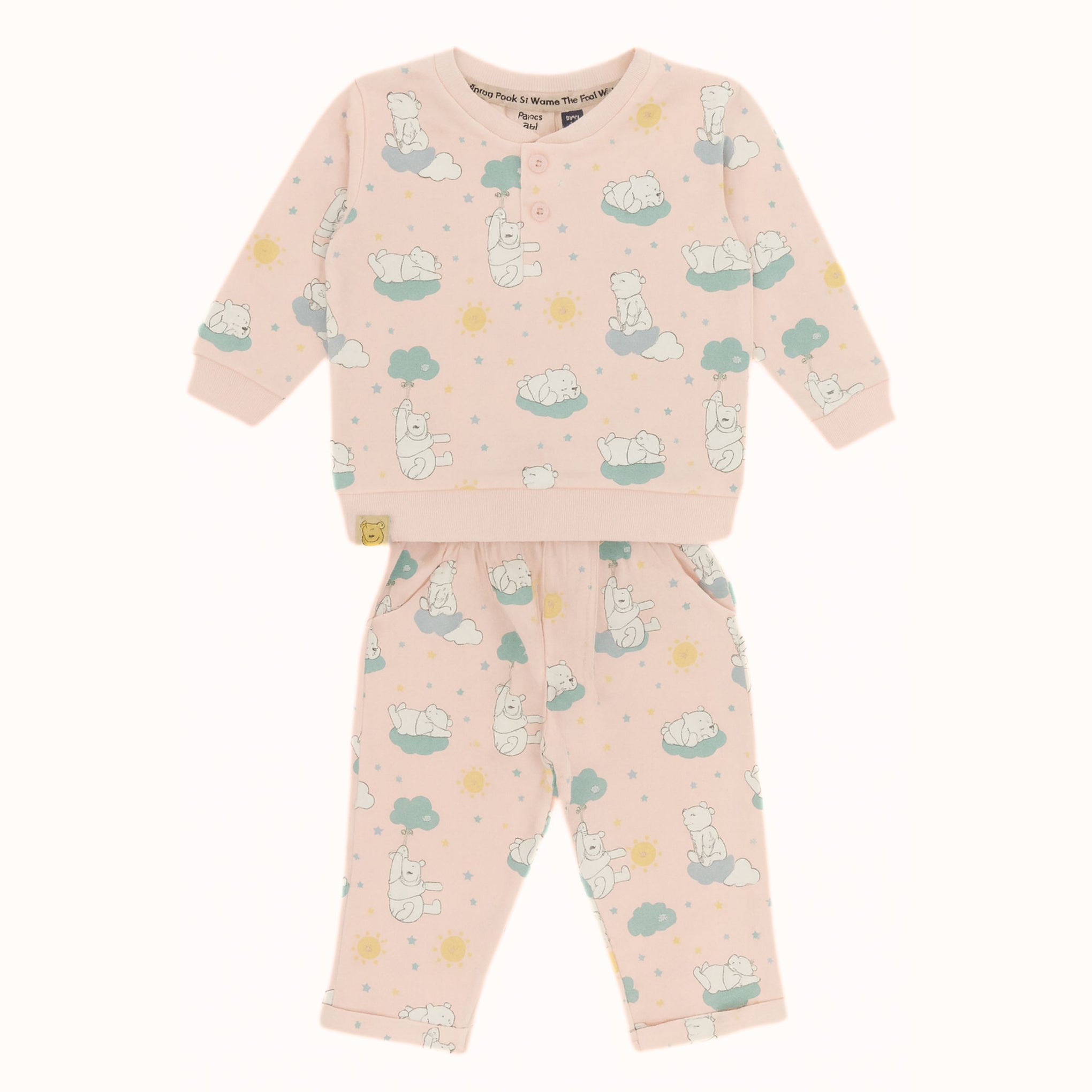 Let your little princess drift into dreamland with this adorable OLLYPOP Winnie the Pooh Night Suit for Girls. Crafted from ultra-soft, breathable cotton, this set features a full-sleeve top and matching pants with delightful Winnie the Pooh prints, cheerful suns, and fluffy clouds. Gentle on baby skin and perfect for cozy naps or playful mornings — comfort meets cuteness in every stitch!