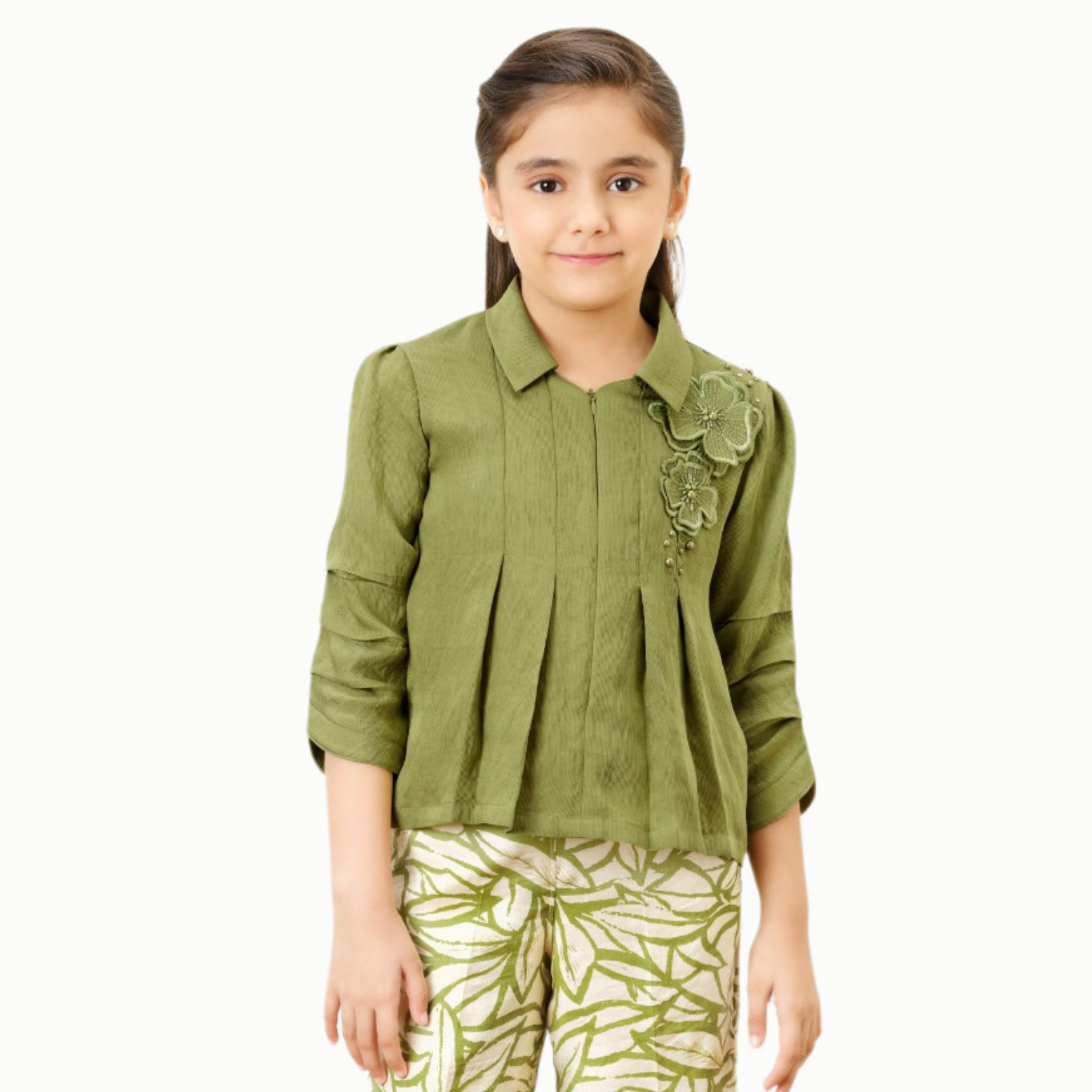 Dress your little girl in timeless elegance with this Tiny Baby Girls Olive Green Co-ord Set, designed for style and comfort. The outfit features a solid olive green pleated top with a beautiful floral applique and bead detailing on the shoulder, paired with cream and green printed wide-leg palazzo pants. Made from soft, breathable fabric, this outfit is perfect for festive gatherings, parties, or casual occasions. The sophisticated color palette and modern design make it a classy addition to any young fashionista’s wardrobe.